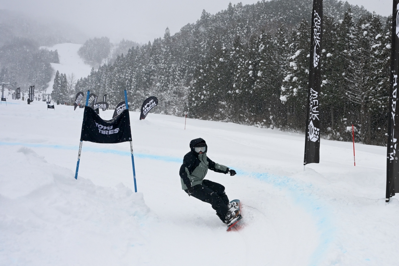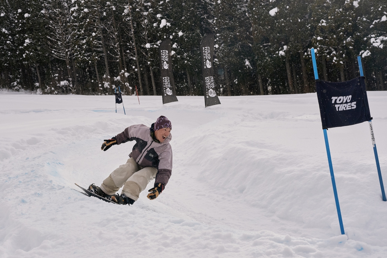 「ここで滑るのは、タイムを出したいからじゃないんだよね。気持ちいいから滑っちゃう。天神(TENJIN BANKED SLALOM)はかなり気合いを入れないと大ケガするくらいハードコアなコースだけど、ここはピースな感じだった。大輔やローカルが作る空気が優しいんだろうね。大人からキッズまで参加して遊んでいるのは、やっと日本にフリースタイルスノーボードの文化が根づいてきた証拠だと思うな。そのうち家族3世代で参加とかもあるんじゃない?(笑)」