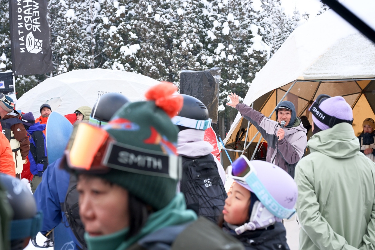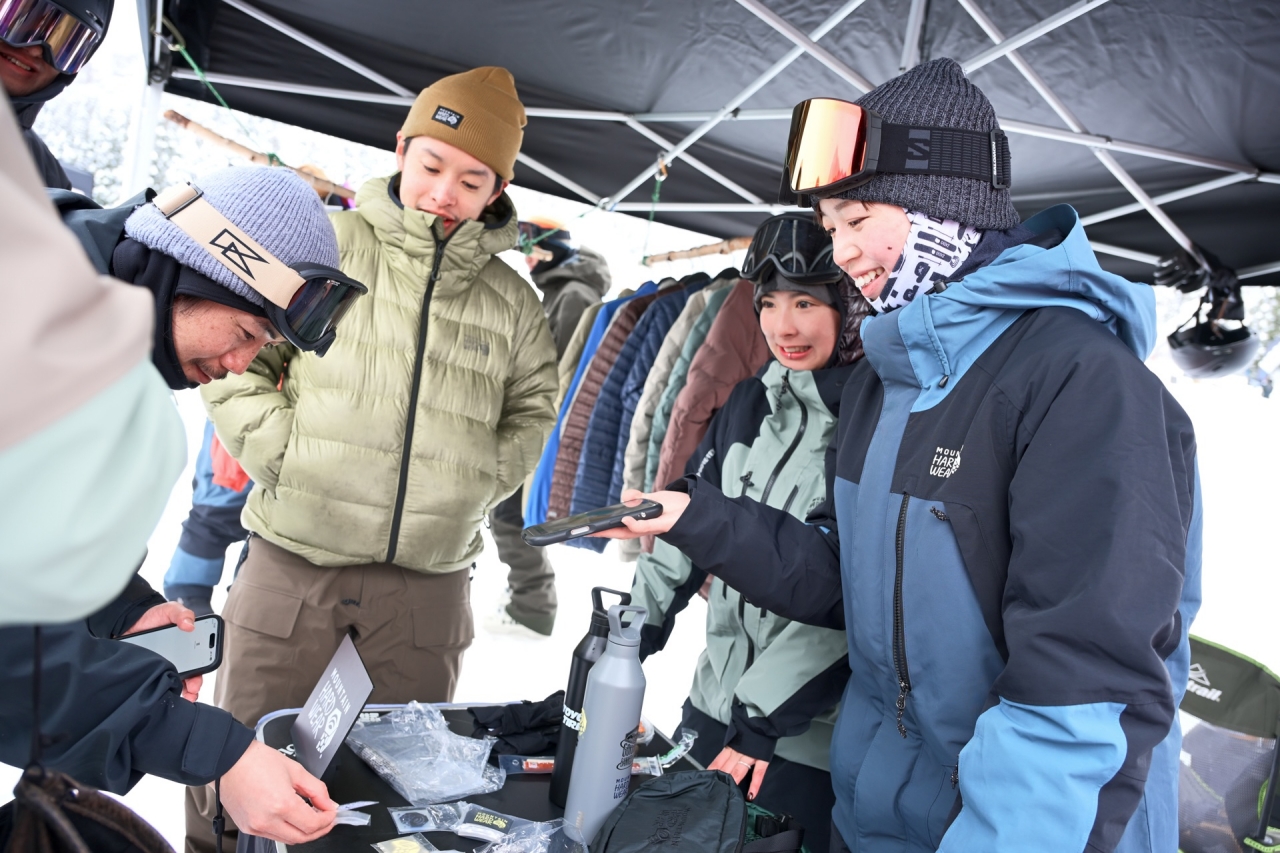 バンクドを滑り終えた参加者たちがブースに立ち寄り、「このウエア、めっちゃ調子よさそうですね」とスタッフと語り合う。また、会場を見渡せば、水間の影響力とローカルからの信頼の厚さを物語るように、MHWのウエアに身を包んだ参加者が数多く雪上を駆けていた。ハードコアなアルパイン環境だけでなく、こうした草の根の「遊び場」にも等しく寄り添い、現場でユーザーと直接コミュニケーションをとる。それこそが、MHWというブランドの奥深さである。