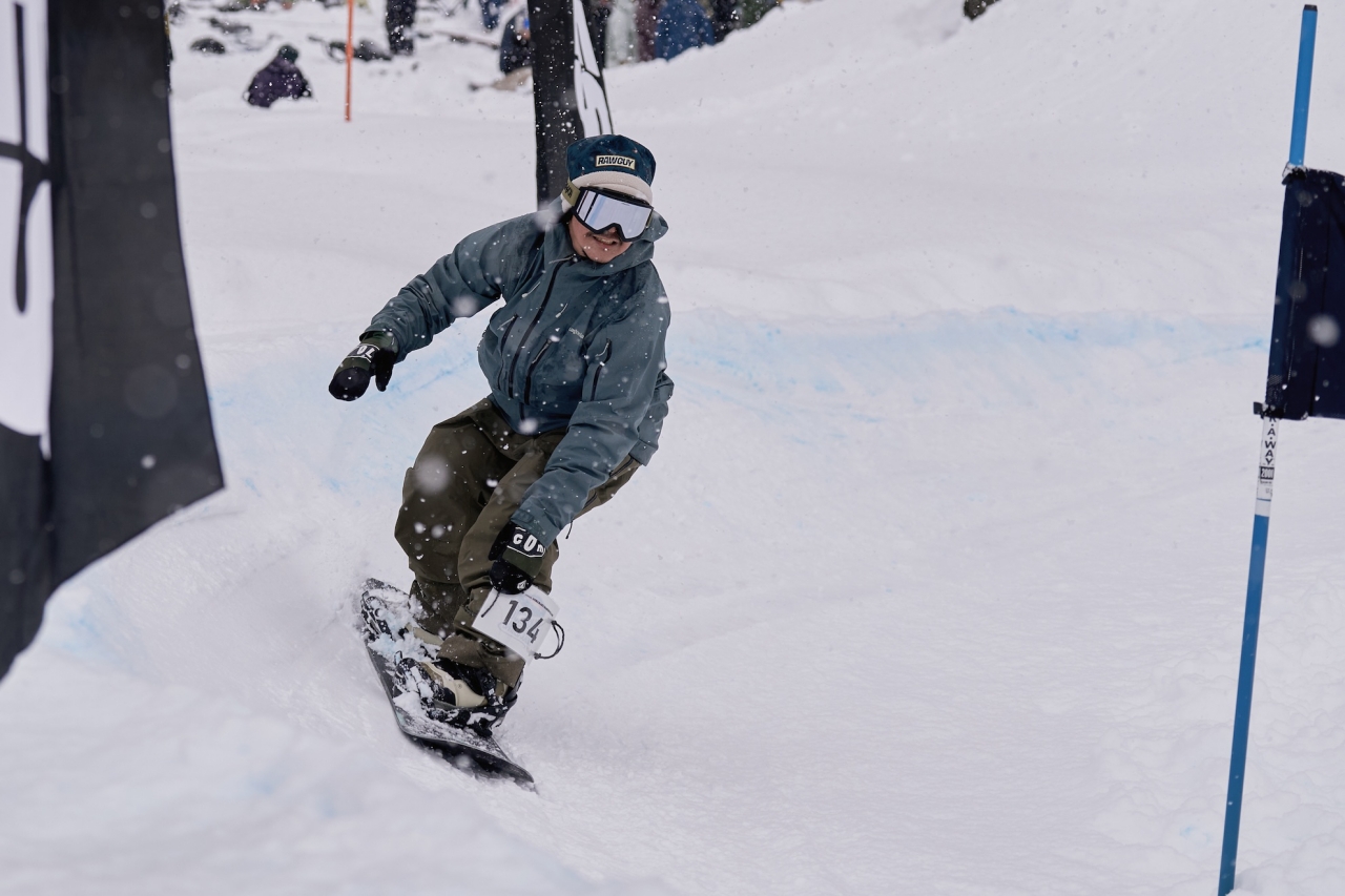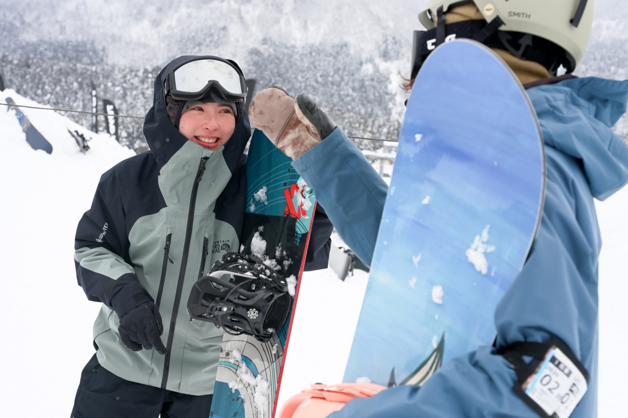 大会当日。事前の雪予報どおり若干の降雪があったものの、開会式のタイミングでは雲間に日が差し込んでいた。初めての大会、見知らぬ土地。スタート地点で緊張の面持ちを浮かべている女性がいた。ブランドの世界観を伝える国内唯一の路面店「MOUNTAIN HARDWEAR HARAJUKU」のスタッフ、武田さんだ。スノーボードは大学時代に少し経験した程度で、バンクドスラロームの大会に出場するのはこれが初めてである。