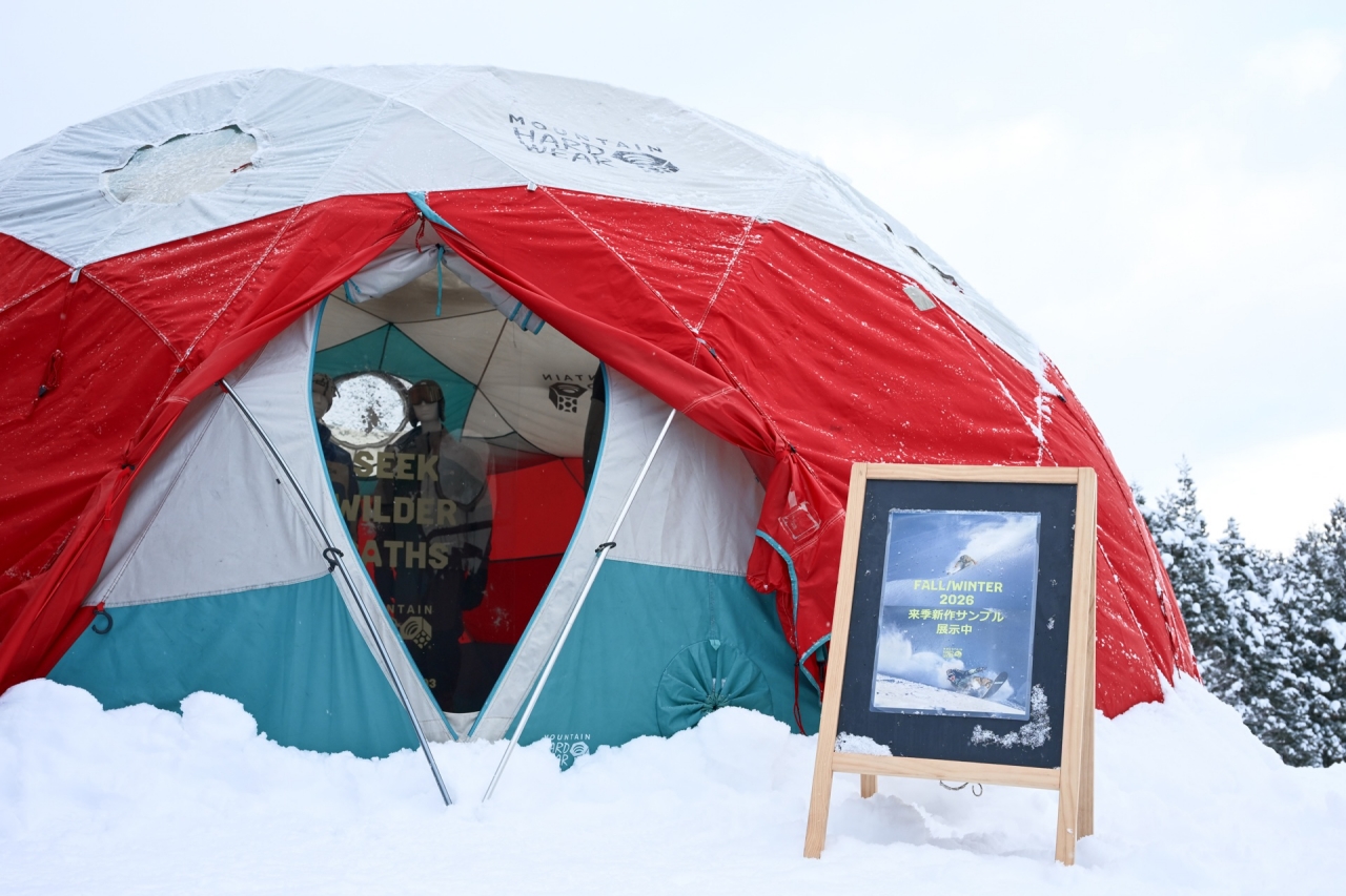 エベレスト登山でも使用される巨大なドームテントが極楽バンクドに出現。内部には来季モデルのギアがズラリと並ぶ