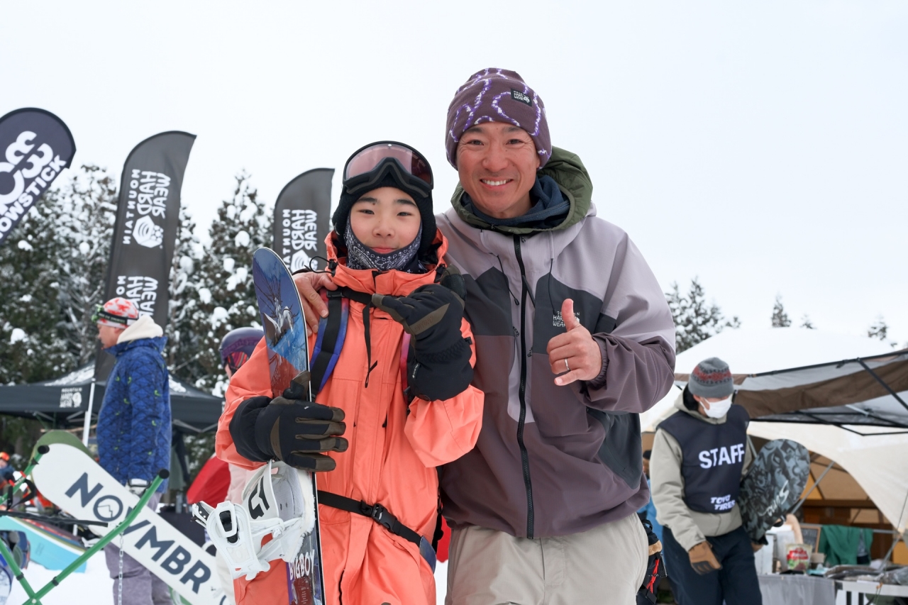 水間の息子・岳くんもそのひとり。1本目は緊張してしまったらしく「もうちょい行けた」と悔しさを滲ませつつも、「お父さんと同じコースで滑れてうれしい」と笑顔を見せた。